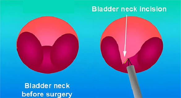 Endoscopic incision of the bladder neck to improve urine flow in obstruction cases.